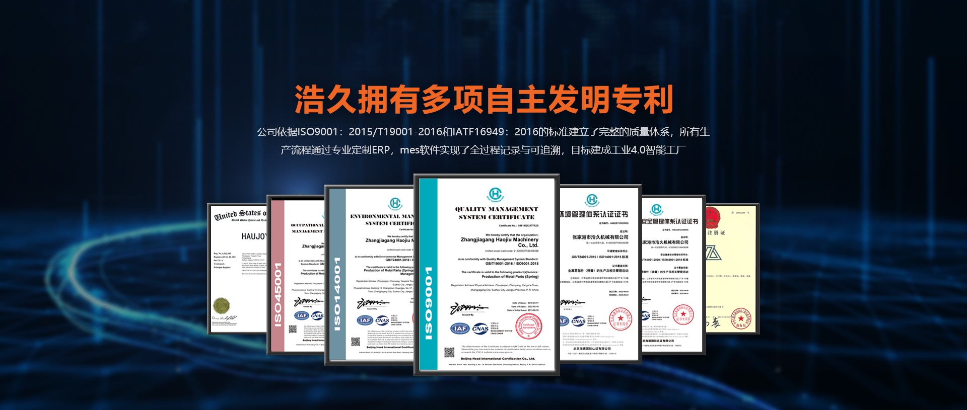 浩久擁有多項(xiàng)自主發(fā)明專(zhuān)利。公司依據(jù)ISO9001GB/T19001-2016和IATF:2016的標(biāo)準(zhǔn)建立了完整的質(zhì)量體系,所有生產(chǎn)流程通過(guò)專(zhuān)業(yè)定制ERP,mes軟件實(shí)現(xiàn)了全過(guò)程記錄與可追溯,目標(biāo)建成工業(yè)4.0智能工廠(chǎng)。